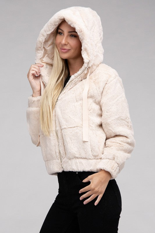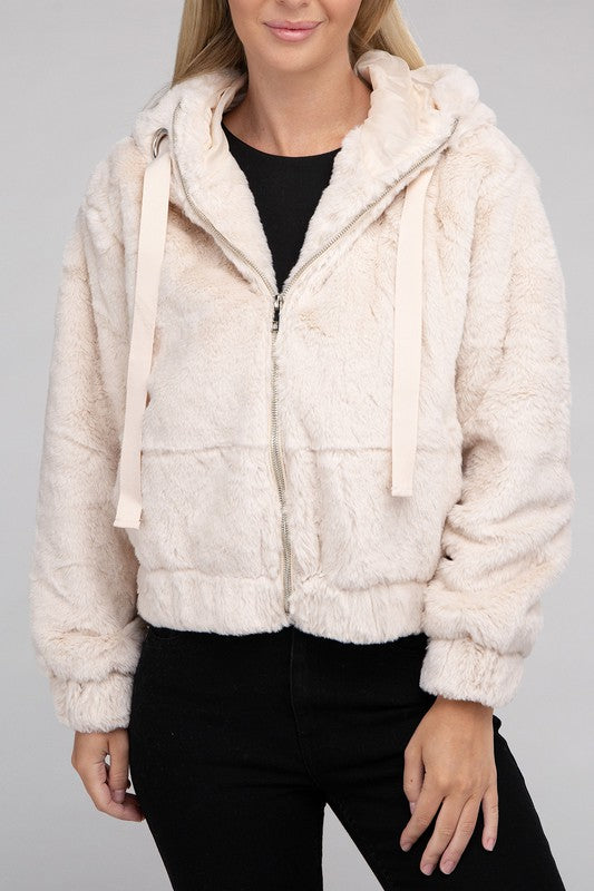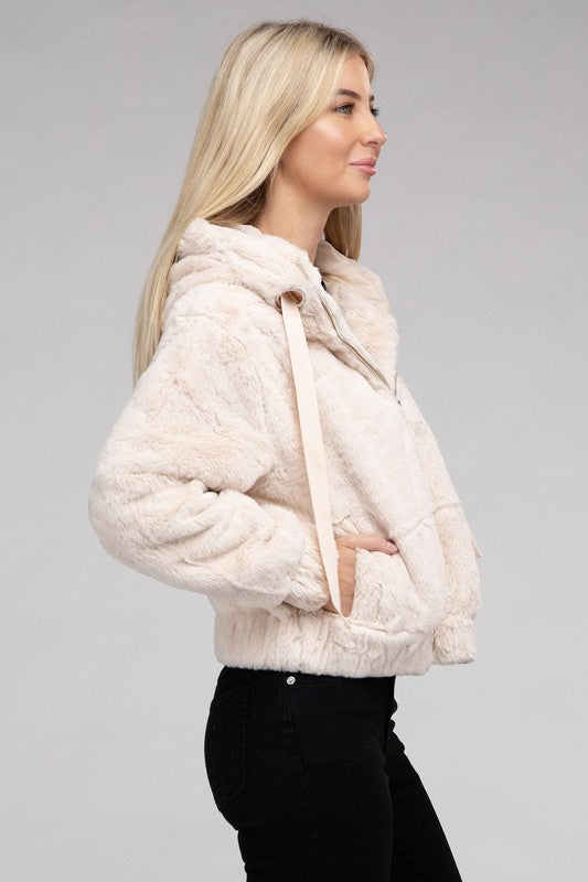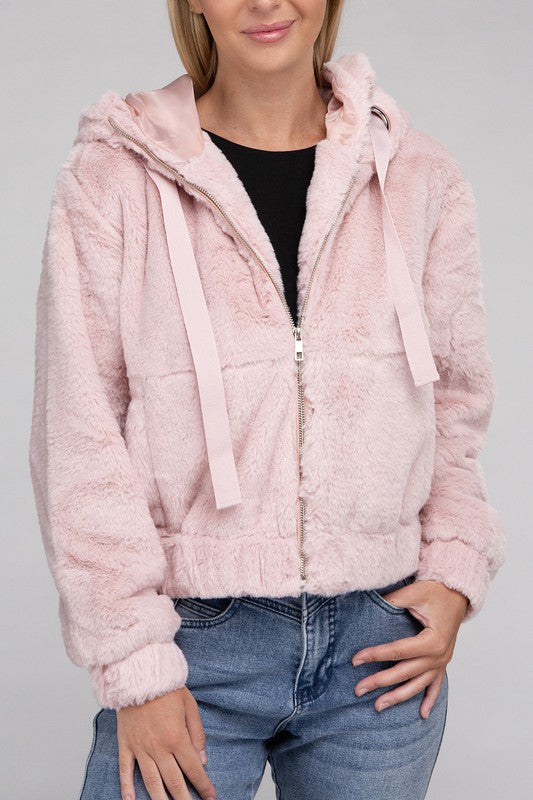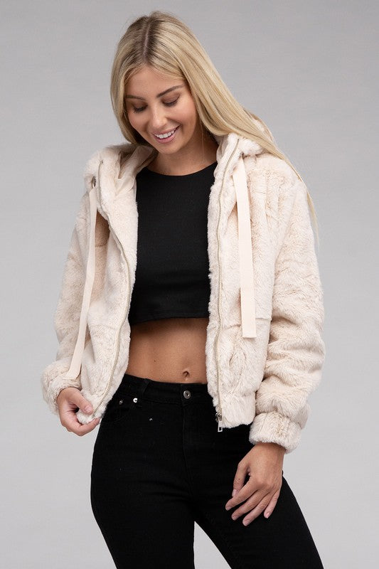 Stay cozy and stylish in our Fluffy Zip-Up Teddy Hoodie. This cropped hoodie features a plush and fluffy texture that's perfect for adding a touch of warmth and luxury to your outfit. It's designed with a convenient zip-up front, pockets for your essentials, and a drawstring hood for added comfort and style.