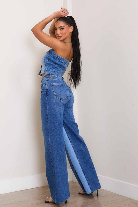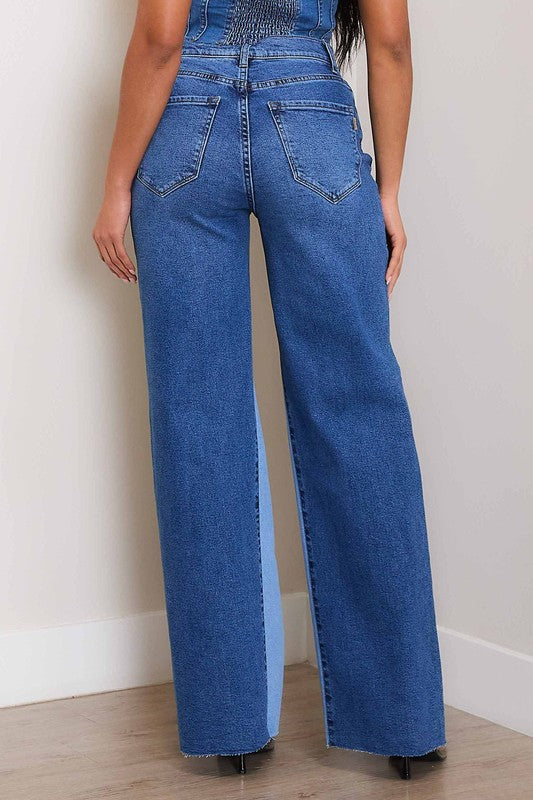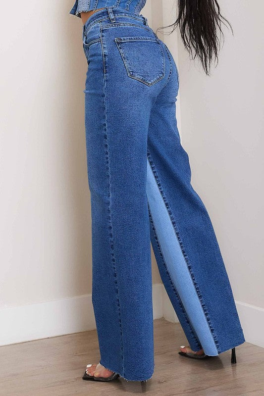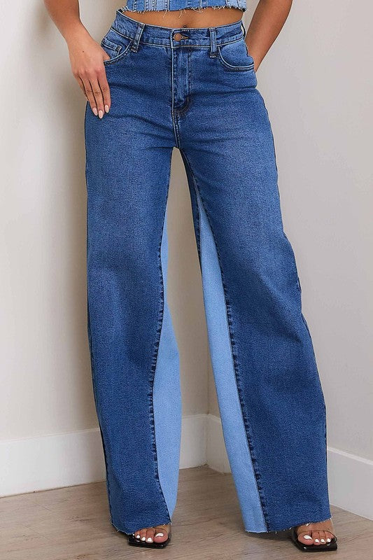 Introducing our High-Rise Color Block Wide Jeans, a bold and stylish addition to your denim collection. Crafted from stretch denim, these jeans offer both comfort and style, allowing you to move freely while looking fabulous. The high-rise waist provides a flattering fit and elongates the legs, while the color block design adds a trendy and eye-catching touch. With a non-distressed finish, these jeans exude a sleek and polished vibe, perfect for both casual and dressed-up occasions.